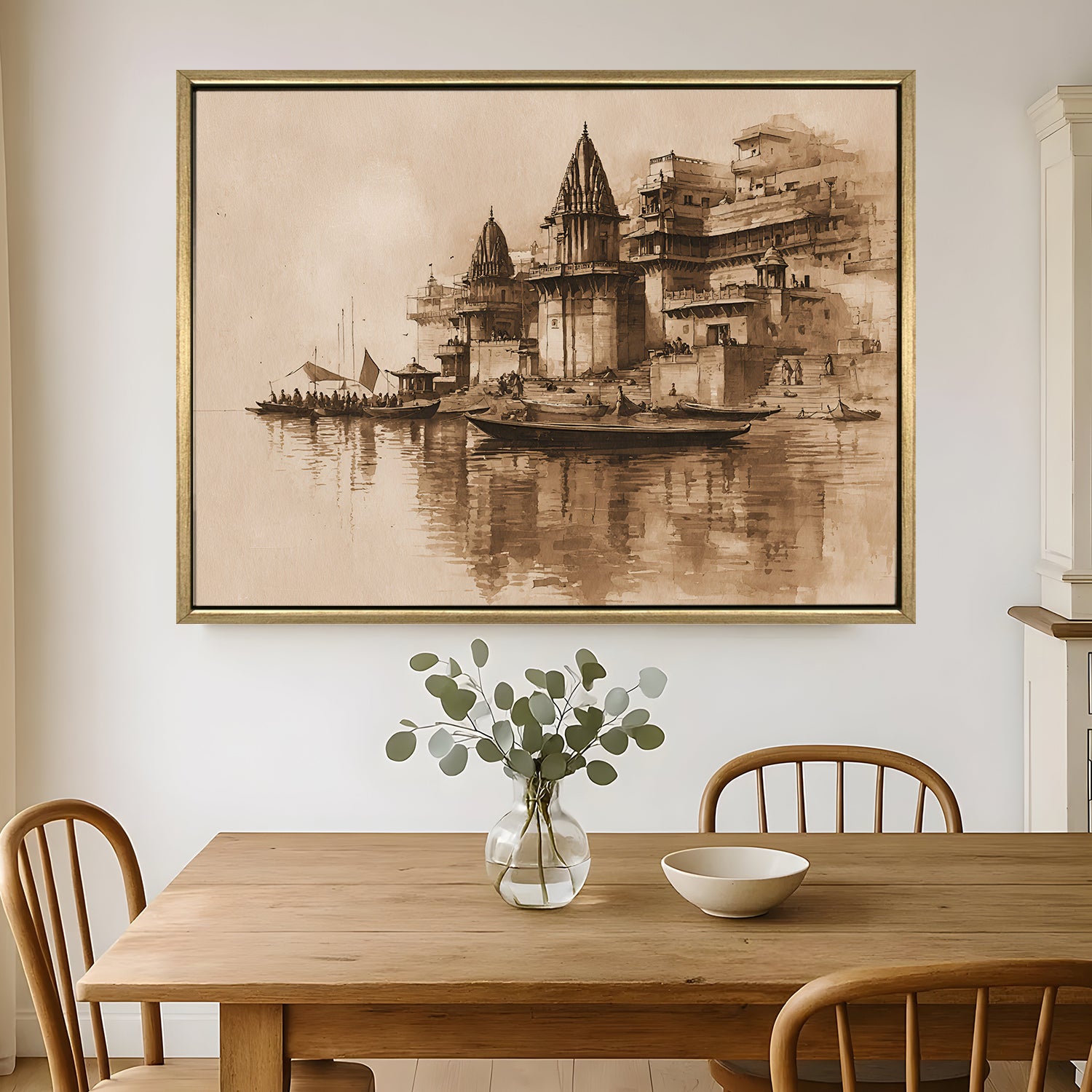 Banaras Ghats Painting Wall Art – Varanasi Riverfront with Golden Floater Frame – HD Print Large Canvas, Ready to Hang, Size: 3X4FT, (BAWA08)