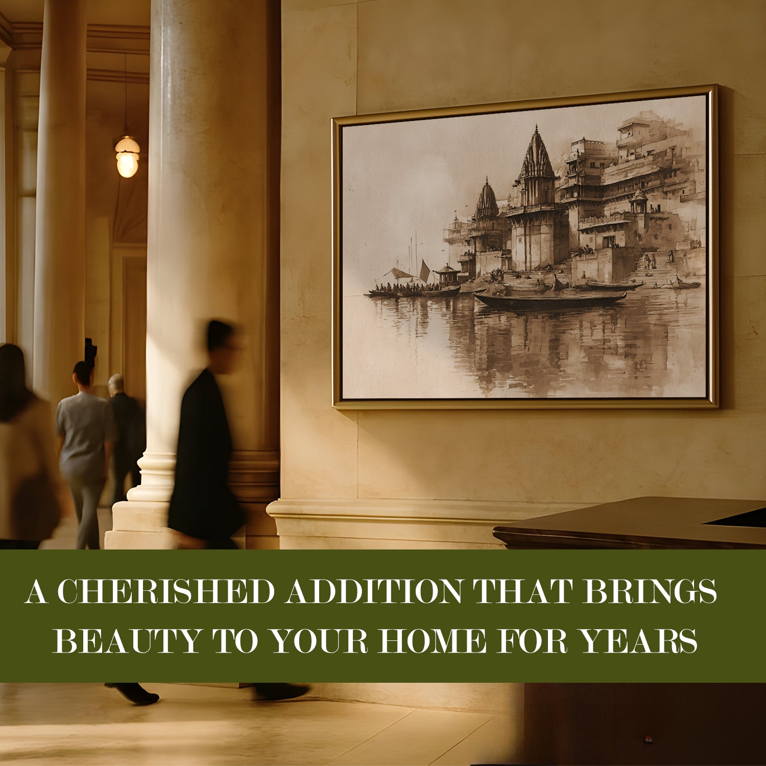 • Authentic Indian Heritage Art – Stunning painting of Varanasi Ghats showcasing temples, boats, and river life in vibrant colors.