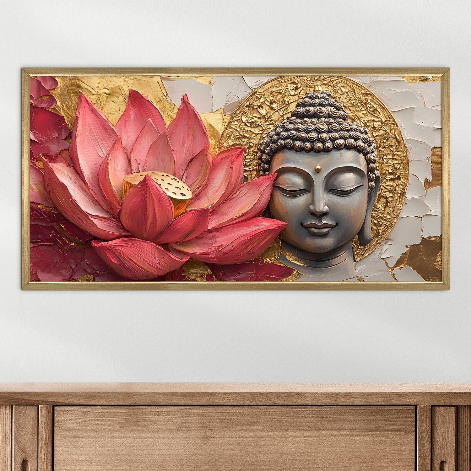 • Serene Buddha Artwork: Elegant Buddha painting surrounded by lotus flowers, symbolizing peace, harmony & positivity for home and meditation decor.