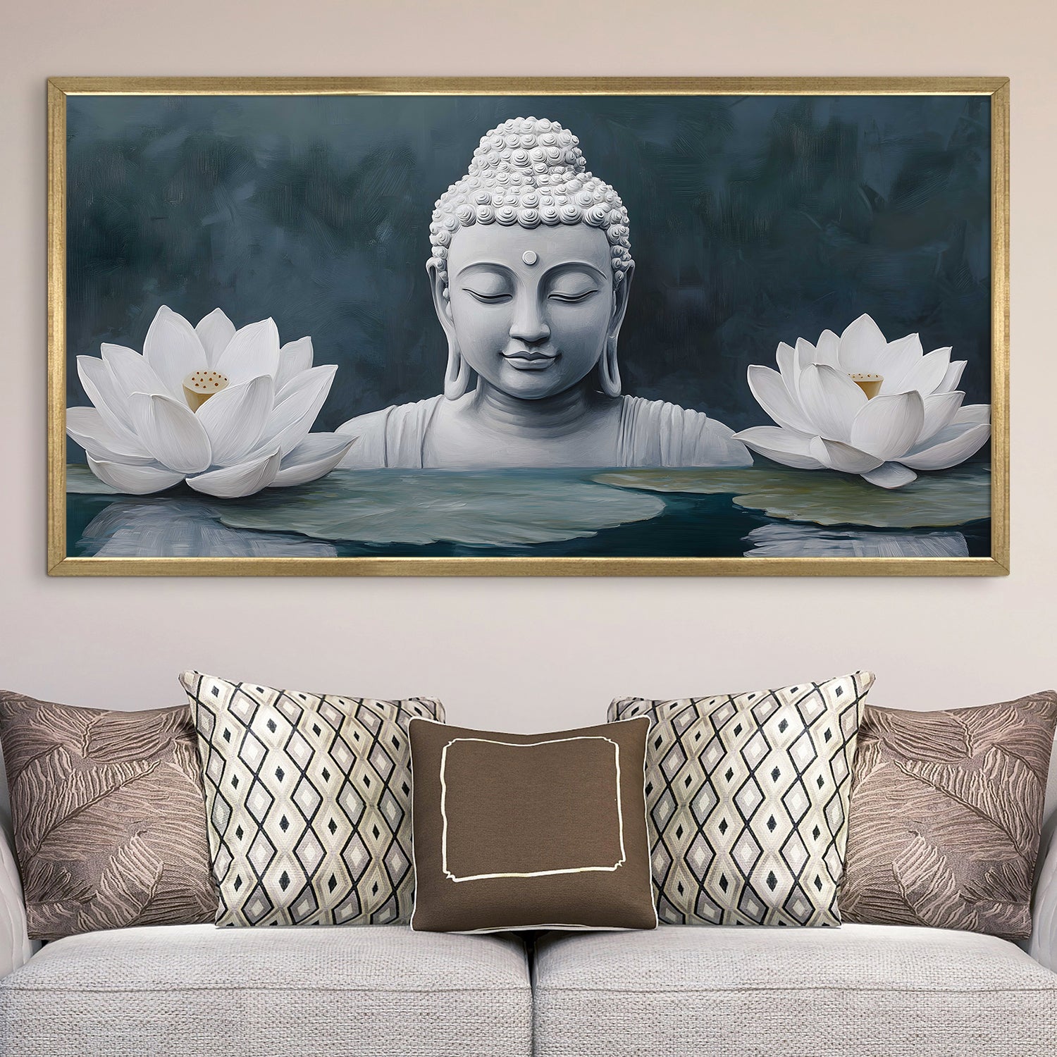 • Serene Buddha Artwork: Elegant Buddha painting surrounded by lotus flowers, symbolizing peace, harmony & positivity for home and meditation decor.