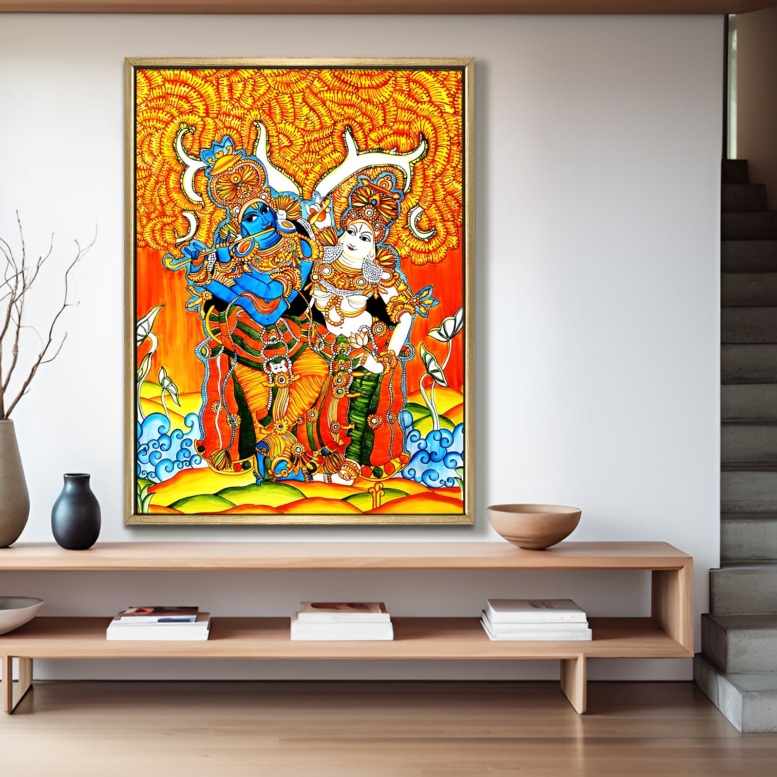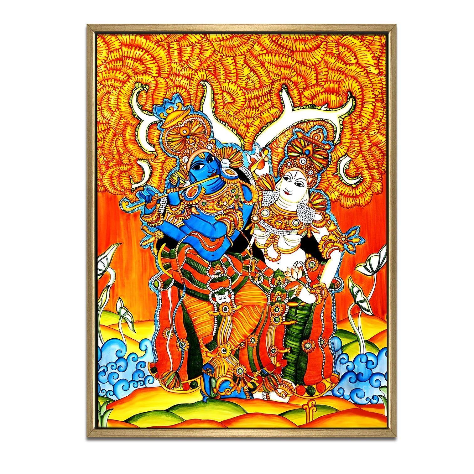 Kerala Mural Canvas Print Painting with Golden Floating Frame – Traditional Indian Wall Art for Home & Office Decor – Size: 3X4 Feet (KAMUWA07)