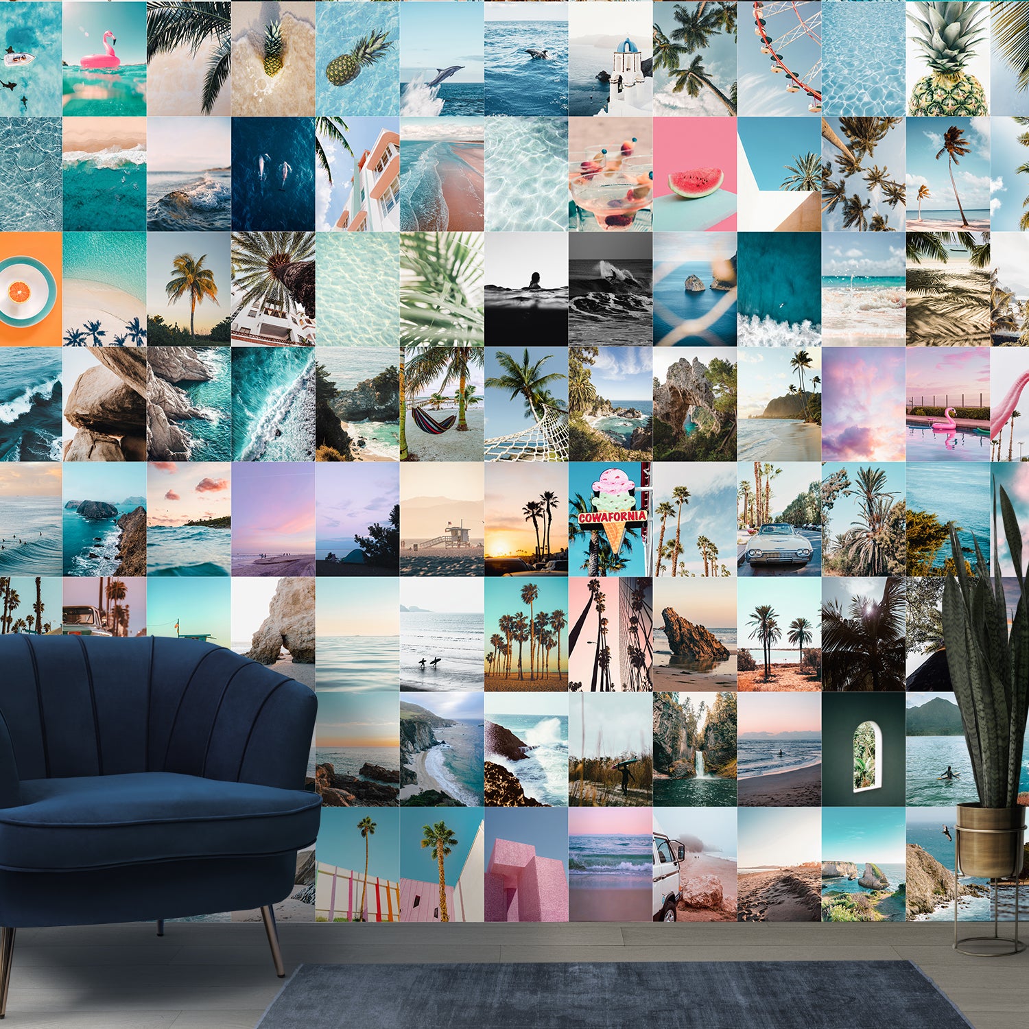 Breathe in the fresh ocean air and surround yourself with sunshine through this stunning tropical beach collage wallpaper mural. A vibrant mix of turquoise waters, palm trees, surfboards, sunsets, and summer lifestyle moments, this design captures the carefree charm of endless vacations and coastal living.