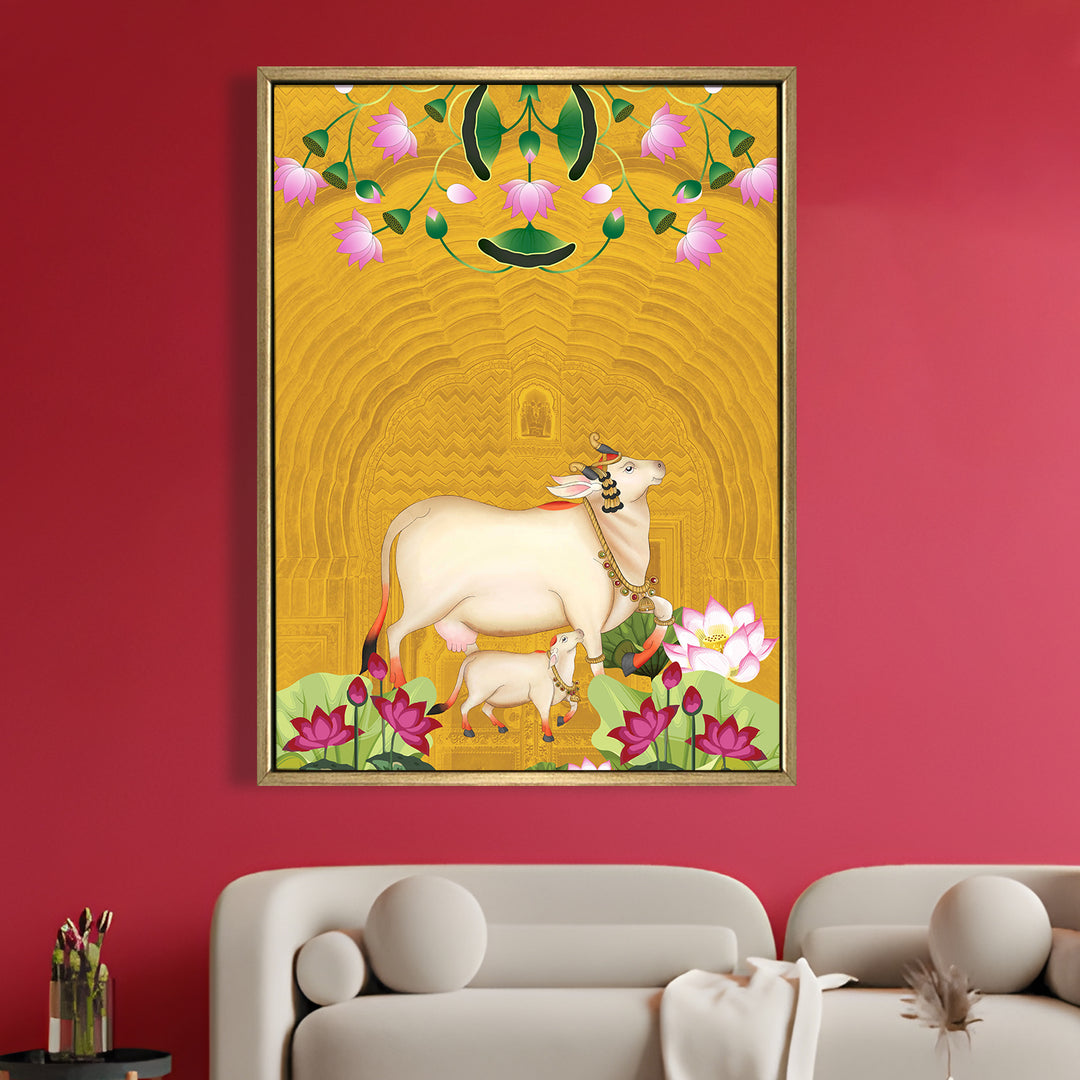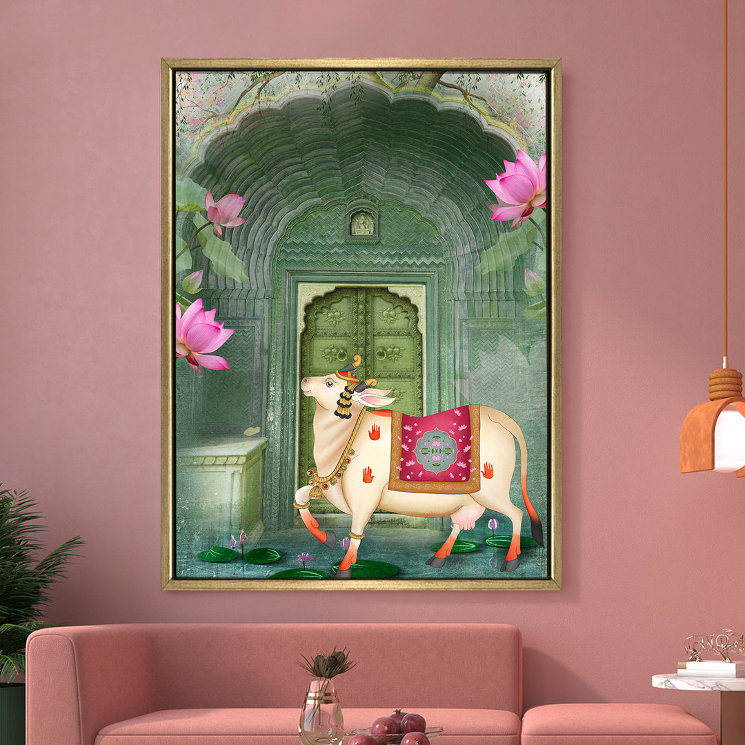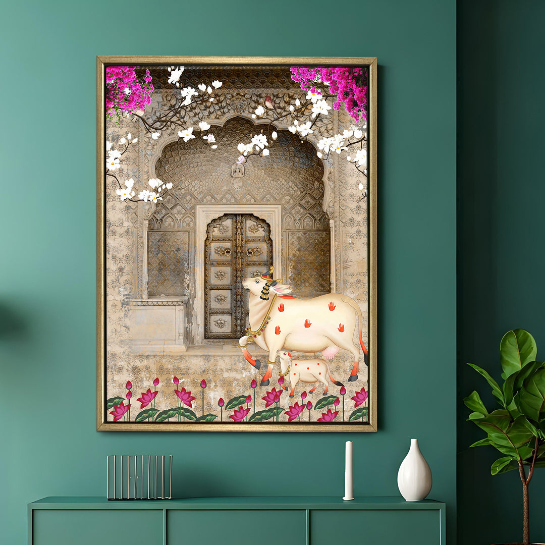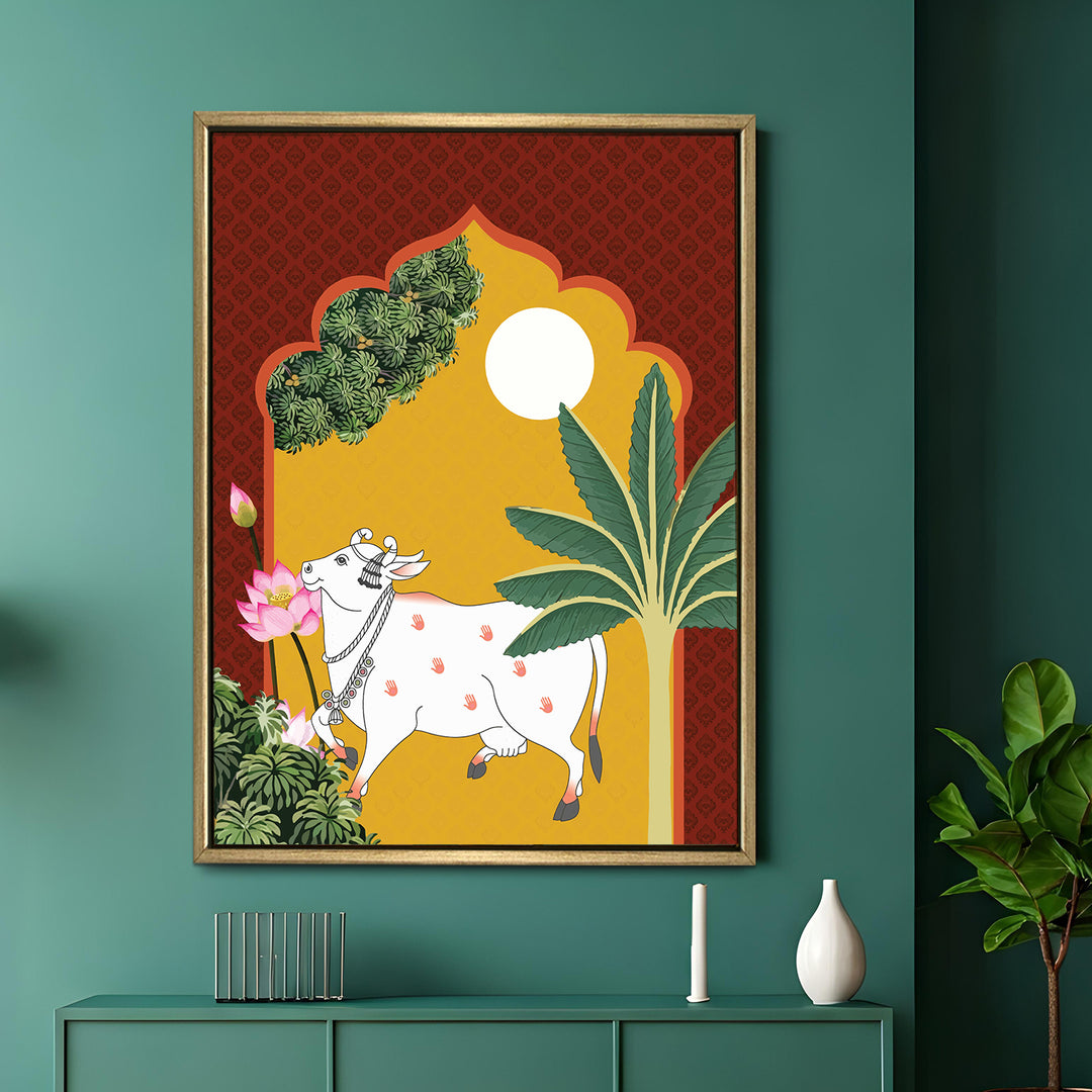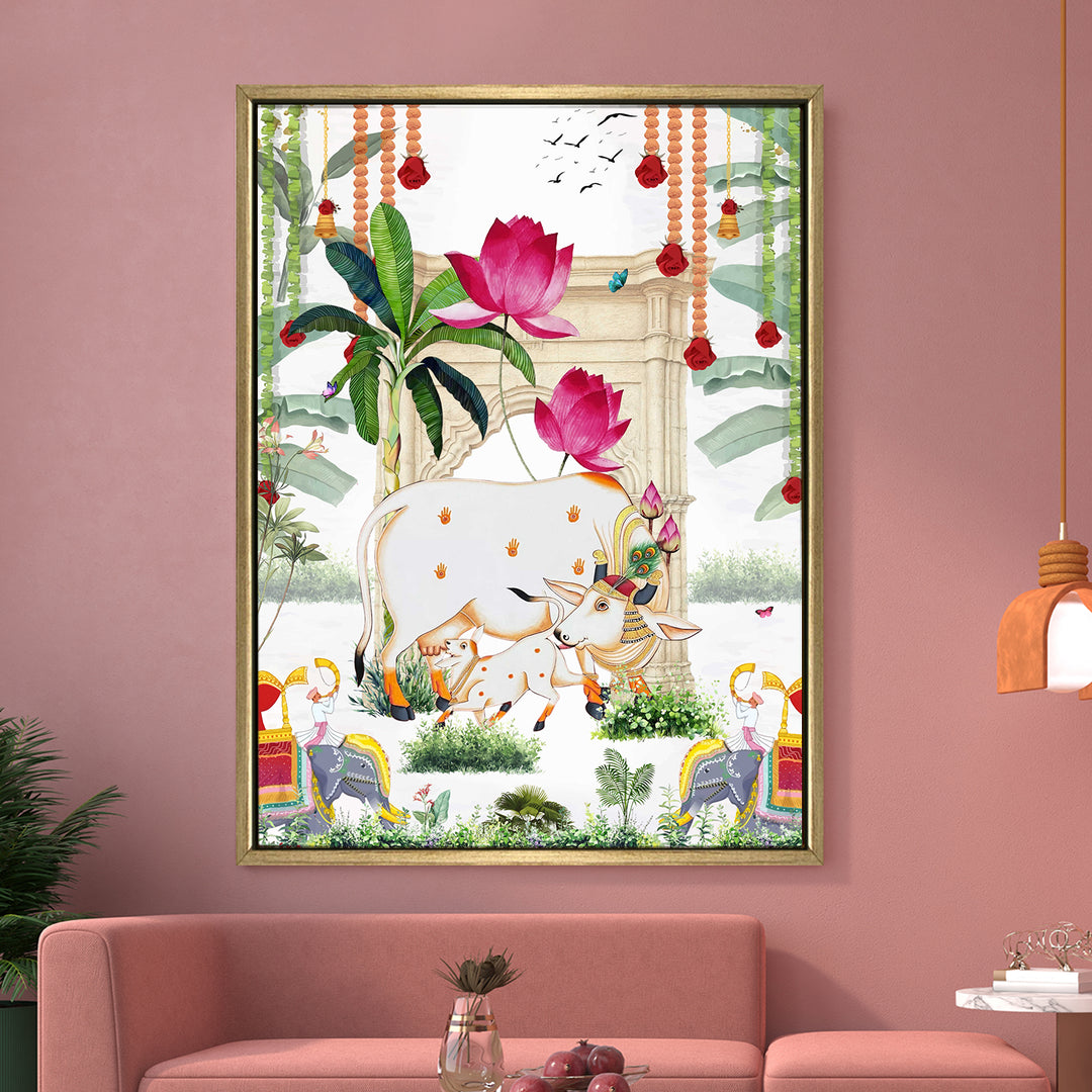 While Pichwai canvas paintings originated as temple adornments, they have evolved to become popular in modern home decor. Their spiritual significance and artistic beauty make them perfect for pooja rooms, living rooms, and offices. Pichwai canvas paintings extend beyond traditional canvases and can be found on cushion covers, carpets, and other home decor items. Despite being scaled down, their beauty and cultural significance remain intact.