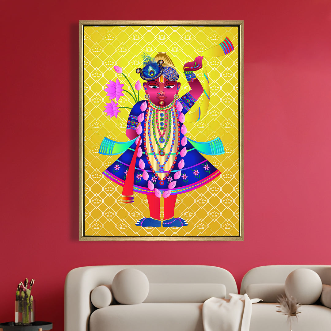Pichwai canvas paintings are not just visually stunning; they are imbued with deep symbolic meanings. Common motifs include lotuses, cows, peacocks, and gopis, each representing different aspects of devotion and nature. The paintings often focus on Lord Krishna, depicting his divine avatars, known as the Chowbees Swaroop, along the borders. The intricate details and bright color palette are a visual expression of love and devotion toward Krishna.