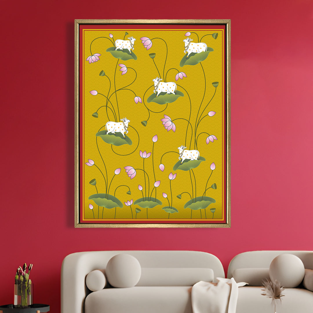 Motifs like lotuses, cows, peacocks, and gopis hold symbolic meaning in Pichwai canvas paintings. For instance, lotuses symbolize purity, while cows are associated with Lord Krishna's life as a cowherd.