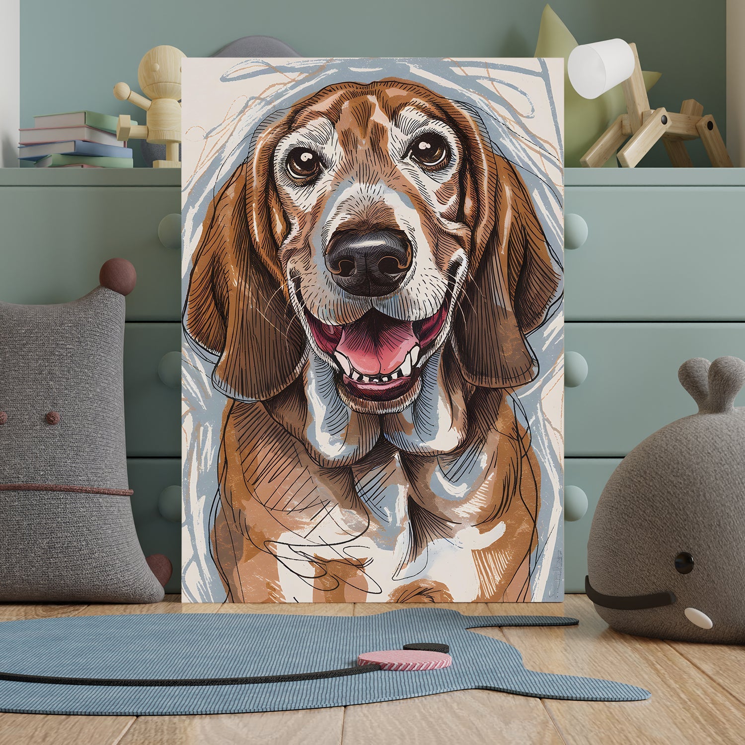 - Semi-Realistic Style: It blends line art and digital painting techniques, giving the dog a lively and expressive appearance. The use of fine lines, cross-hatching, and soft shading adds depth and texture, making it resemble modern pet portraiture with a mix of graphic illustration and realism.