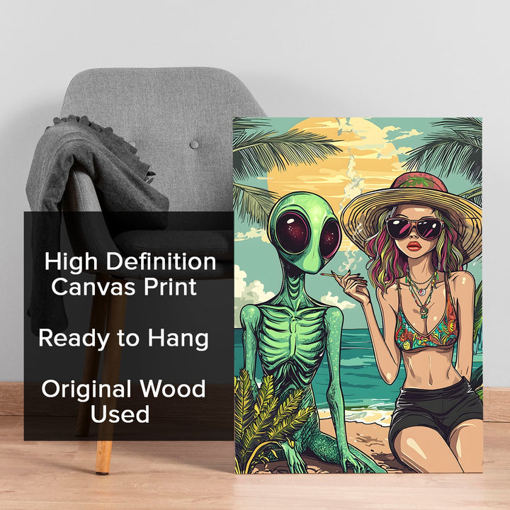 - Pop Art: The bold lines, bright colors, and comic-style shading give it a vintage-inspired pop art feel. The combination of a human and an alien in a casual beach setting creates a dreamlike, surreal vibe.