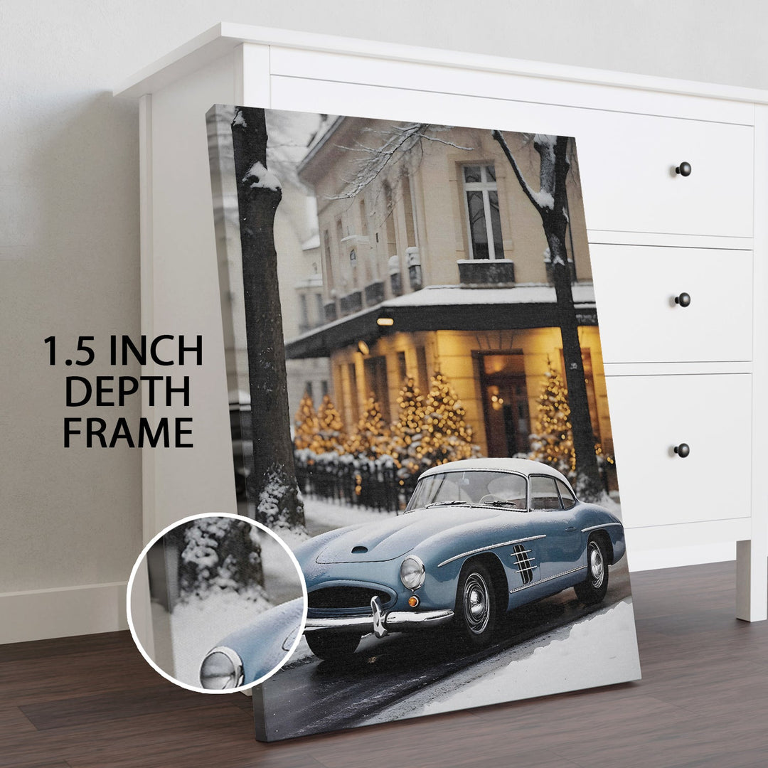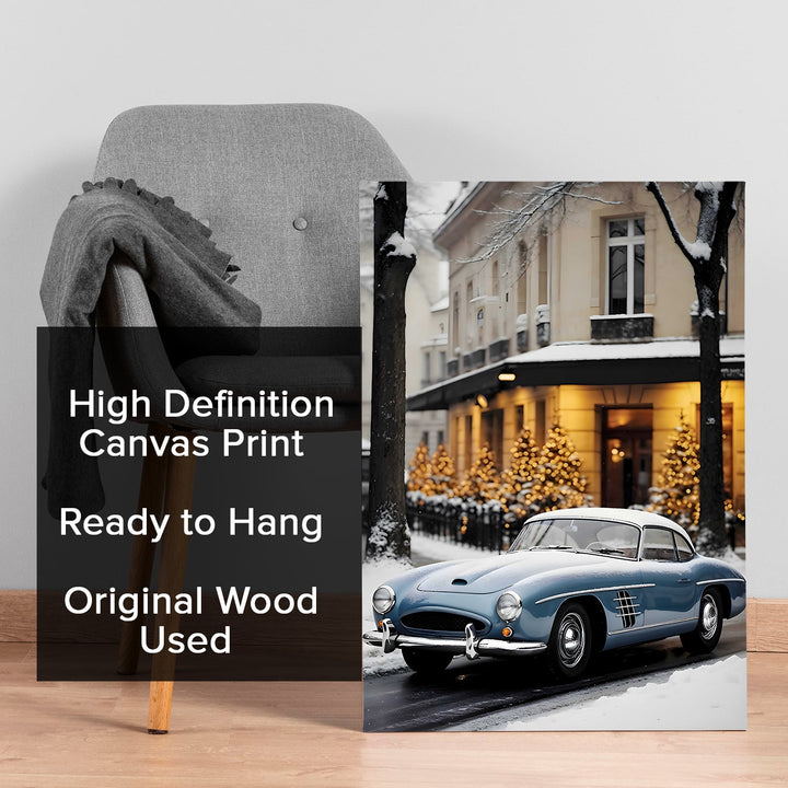 - Vintage Automotive Art: Features a classic Mercedes-Benz 300SL Gullwing in an elegant winter setting. The Christmas decorations and snow create a cozy, nostalgic feel.